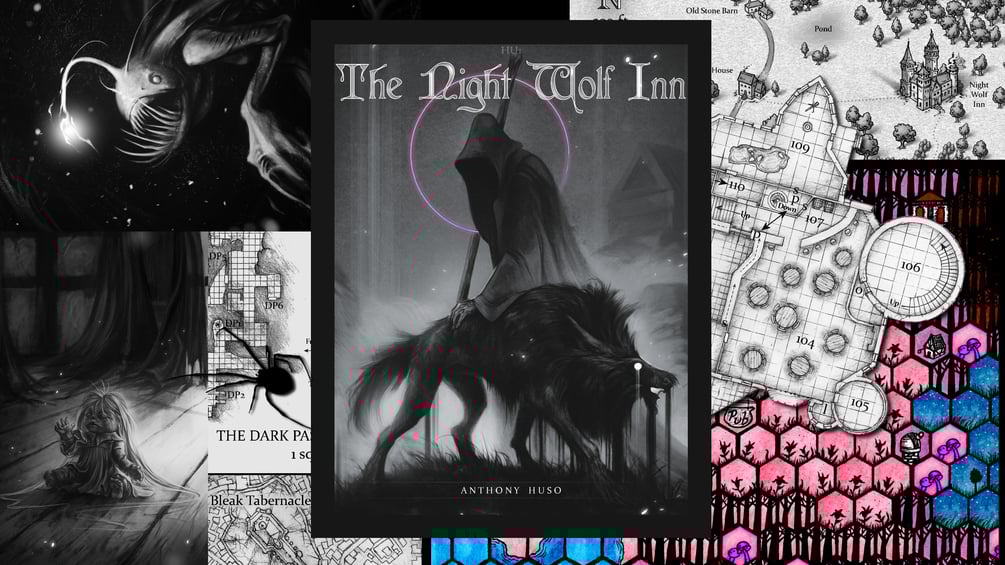 (.ZIP) The Night Wolf Inn is a sand box experience for 1st Edition RPG Gaming. It is a tavern and a universe unto itself; a place of powerful dweomers, secret doors, lost gods, hidden dimensions and dangerous artifacts. The Inn's mysterious backstory holds the sandbox experience together. The Night Wolf Inn fits snugly into any campaign, occupying only the space of its buildings and lawns. It is also intended to be fully customizable. Includes: Fully detailed maps and locations of the Inn featuring four floors, outdoor property, and extra-dimensional spaces. Partially detailed launch points into over twenty pocket dimensions and parallel worlds. Many new magic items, treasures, artifacts, monsters, demons, gods, NPCs, races, languages, and myths. Beautiful art. Player and DM versions of relevant maps. Player handouts. Quick reference cheat sheets. This bundle includes digital maps.